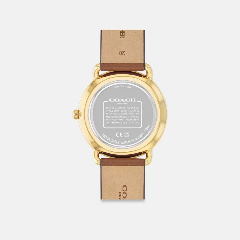 With clean lines and a modern minimalist sensibility, the Elliot is a true design classic ready for workdays and weekends. Finished with a leather strap, this gold tone round watch features a dial detailed with a mix of numerical and stick makers and our Signature marker at 3 o