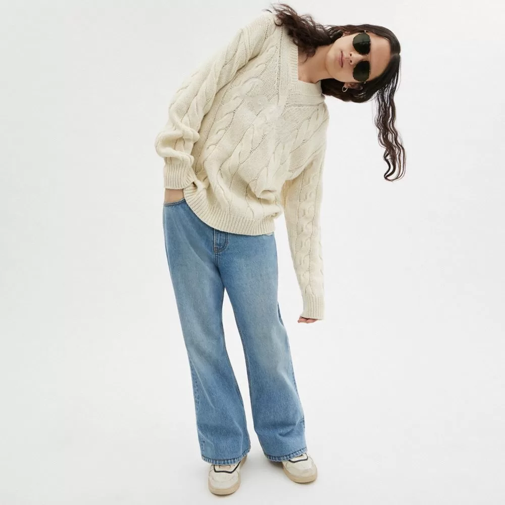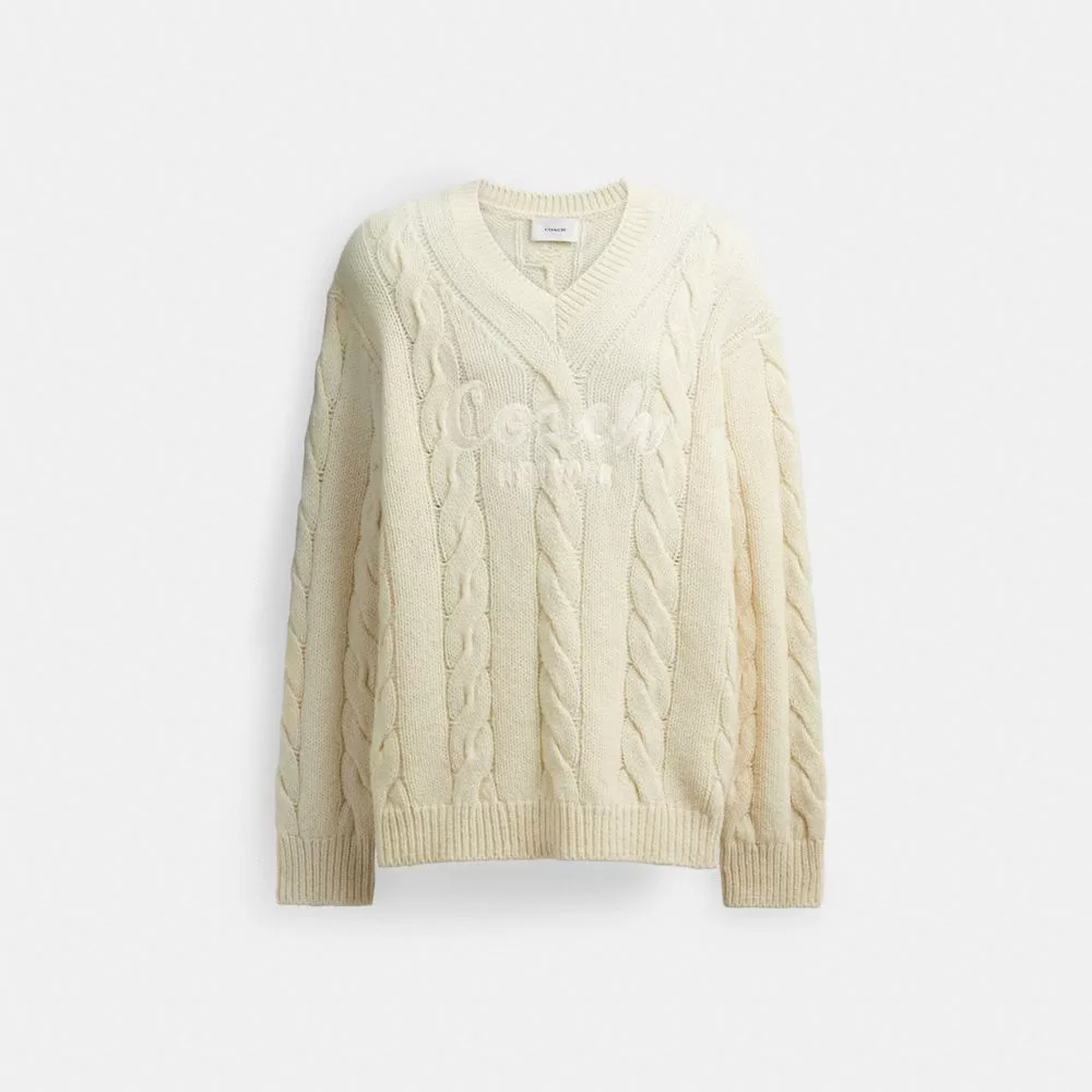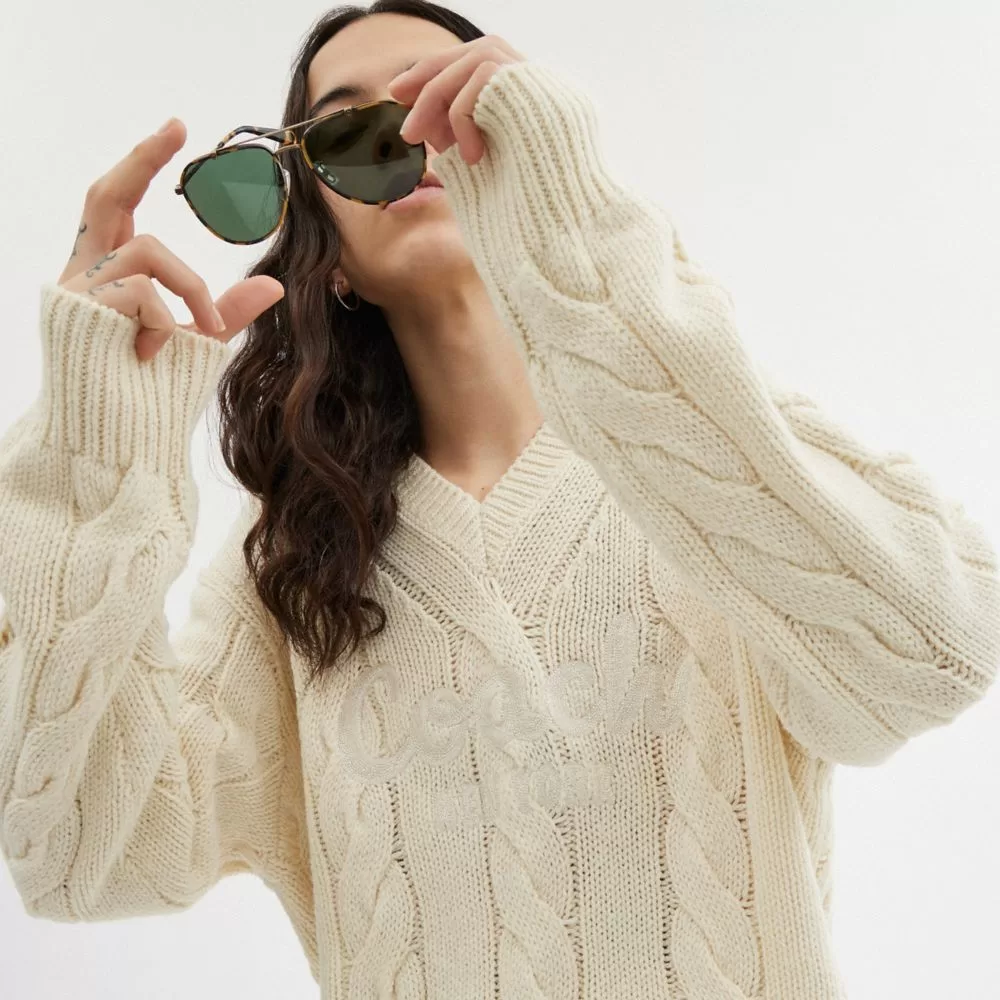 Richly textured with braided cable-knit detailing, this sweater is crafted of recycled wool, inspired by our commitment to rethinking and reducing our impact on the planet. Embroidered with our tonal cursive Coach script, the oversized V-neck design is finished with cozy ribbed trim.