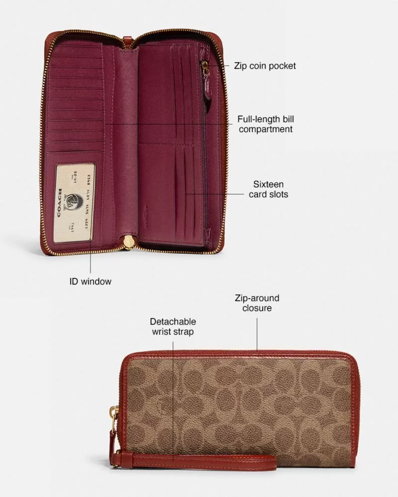 A timeless style made modern with a detachable wrist strap, this Signature canvas and refined leather wallet has a continental zip-around closure and an elongated shape. The organized design has extra room for a phone, receipts, gift cards and small essentials, making it the perfect wallet for everyday.
