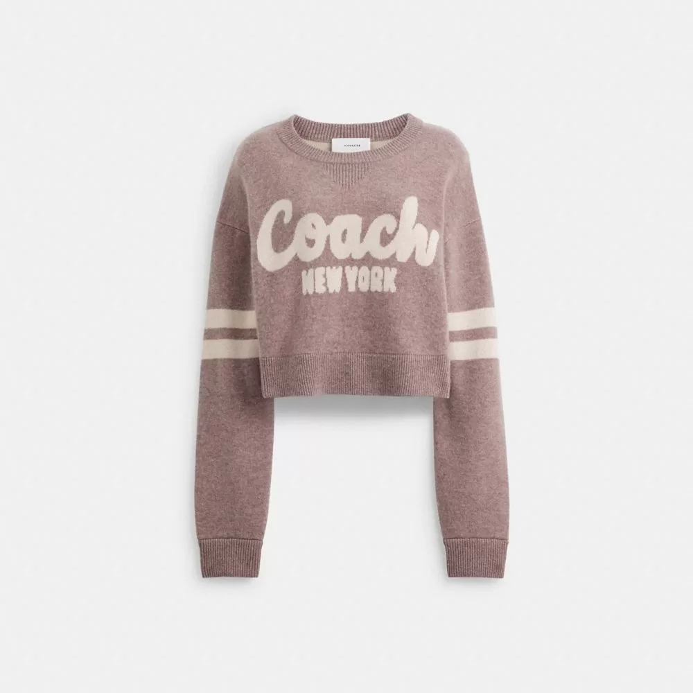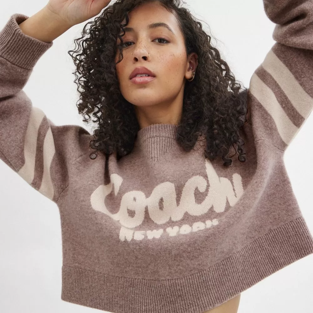 Sporty and super soft, this wool-and-cashmere blend sweater is inspired by vintage sweatshirts. Detailed with our cursive Coach script and Varsity Stripe, the cropped crewneck is finished with athletic V-stitching and cozy ribbed trim.