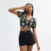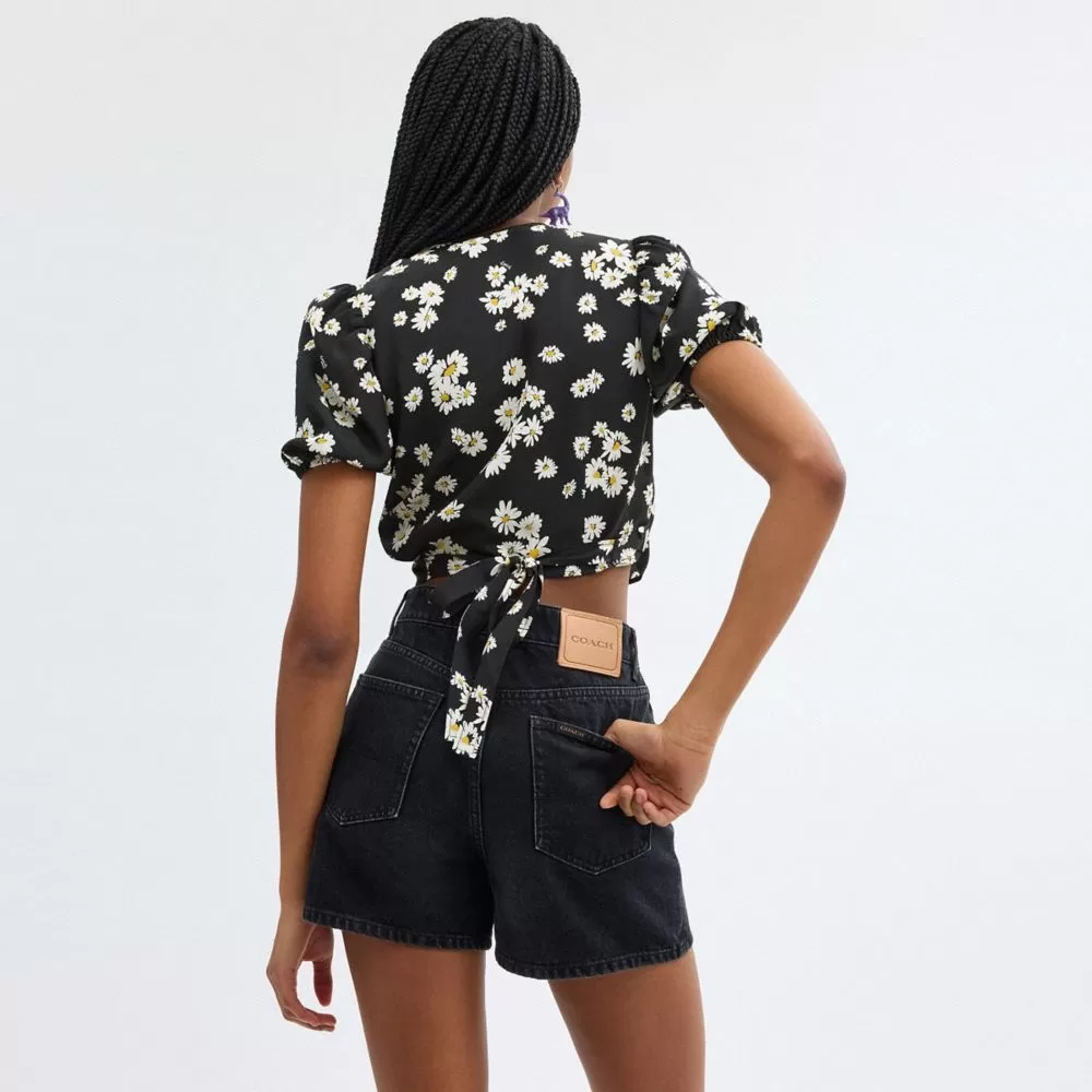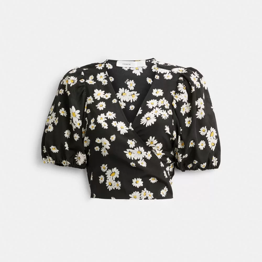 A true wrap design with a tie closure, this lightweight silk blouse features a dramatic daisy motif. The V-neck silhouette is finished with short blouson sleeves.