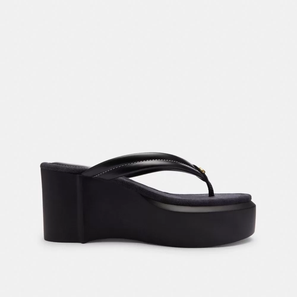 A stand-out style, our Franki is a 1970s-inspired design set high on sturdy wedge platform. Featuring padded straps, the slip-on thong sandal is finished with our Signature hardware and jacquard footbed for a touch of Coach heritage.