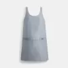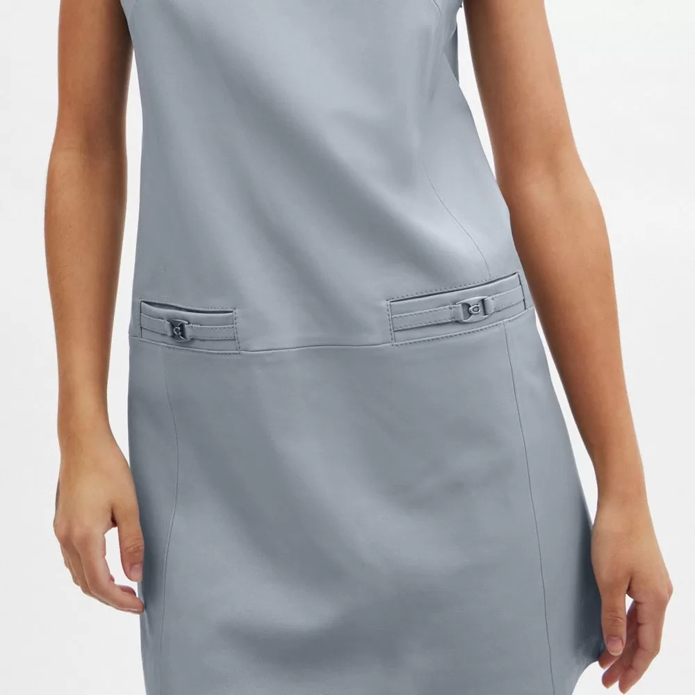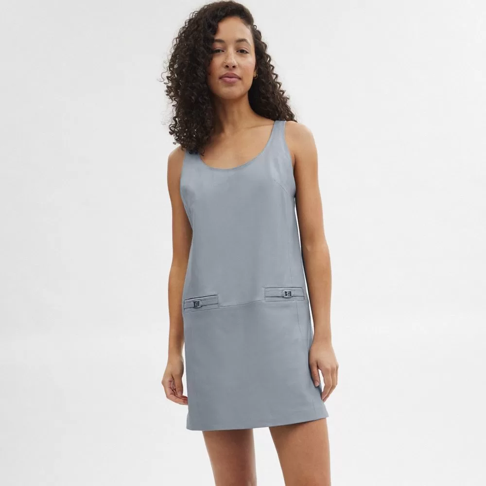 A sleek minimalist style to be worn alone or layered over a top, this sleeveless dress is crafted of buttery soft leather. Detailed with our Heritage C Plaque, the scoop neck design is finished with front slip pockets and a back zip closure.