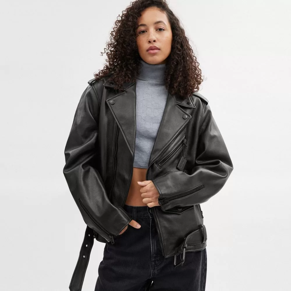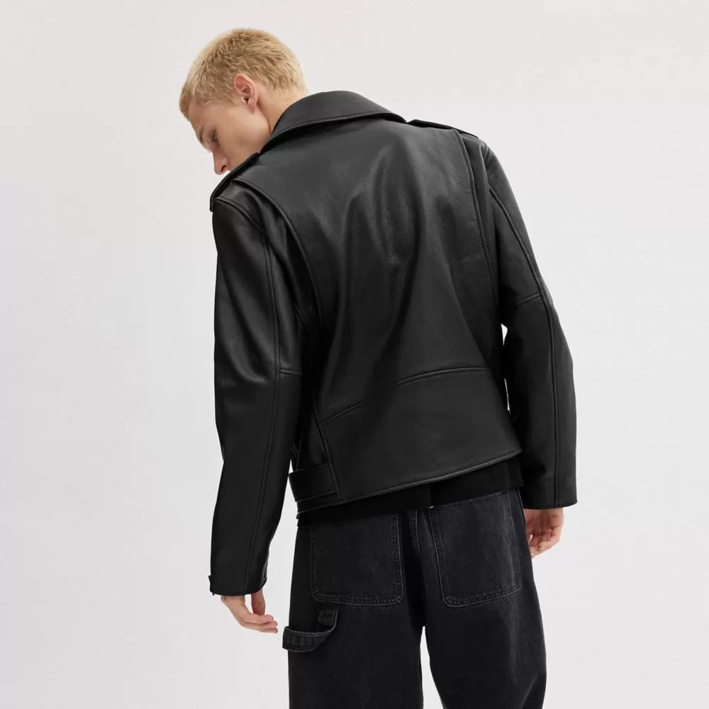 Rev up your wardrobe with our buttery soft leather moto jacket, an iconic Coach style inspired by the freedom of the open road. Finished with our Signature lining, this biker-inspired style features a timeless pointed collar with signature snaps, an asymmetric zip closure, a mix of zip and snap pockets and an adjustable buckle at the hem.