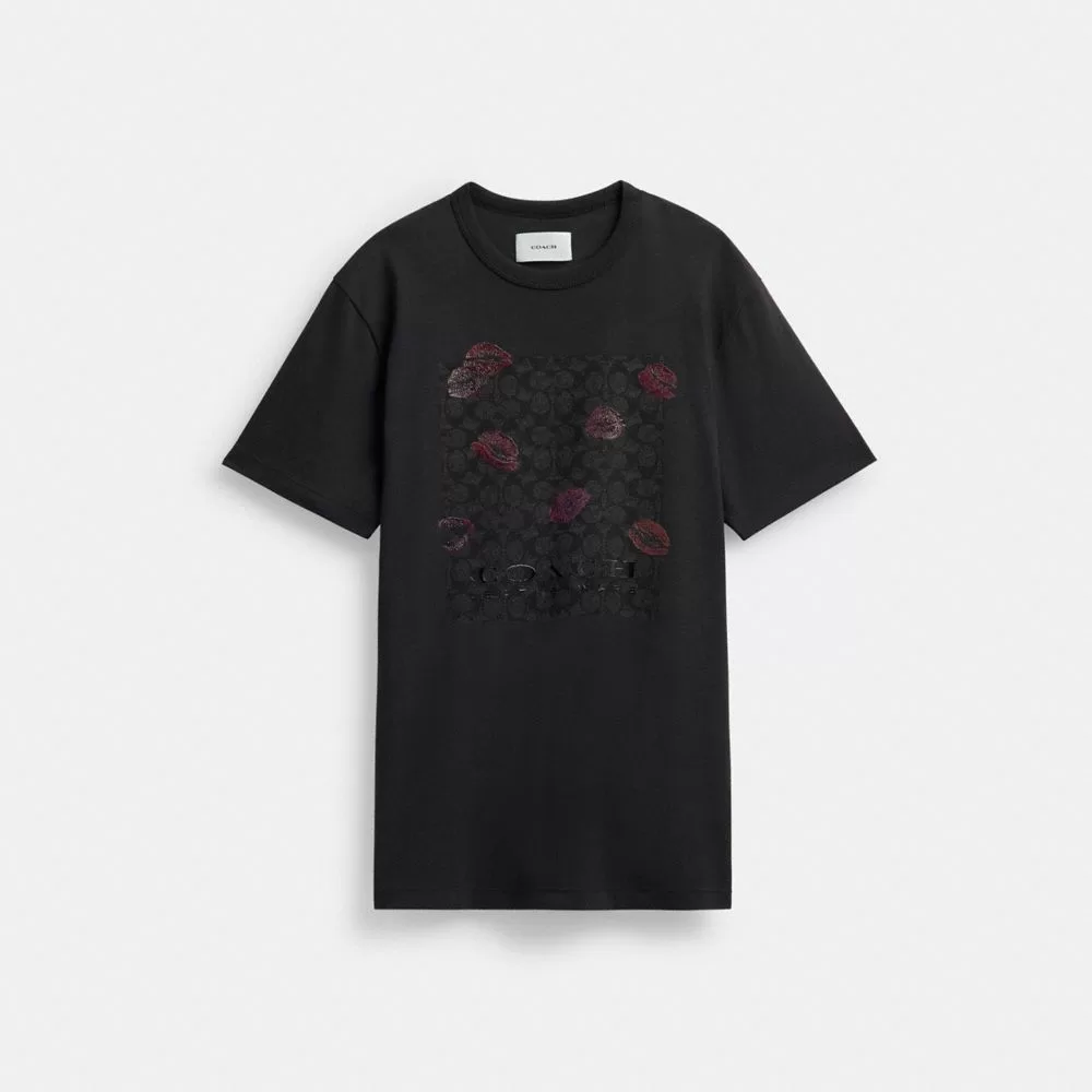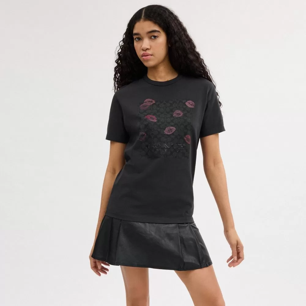 Coach Women Tops Signature Square Kiss Print T Shirt In Organic Cotton Charcoal Multi