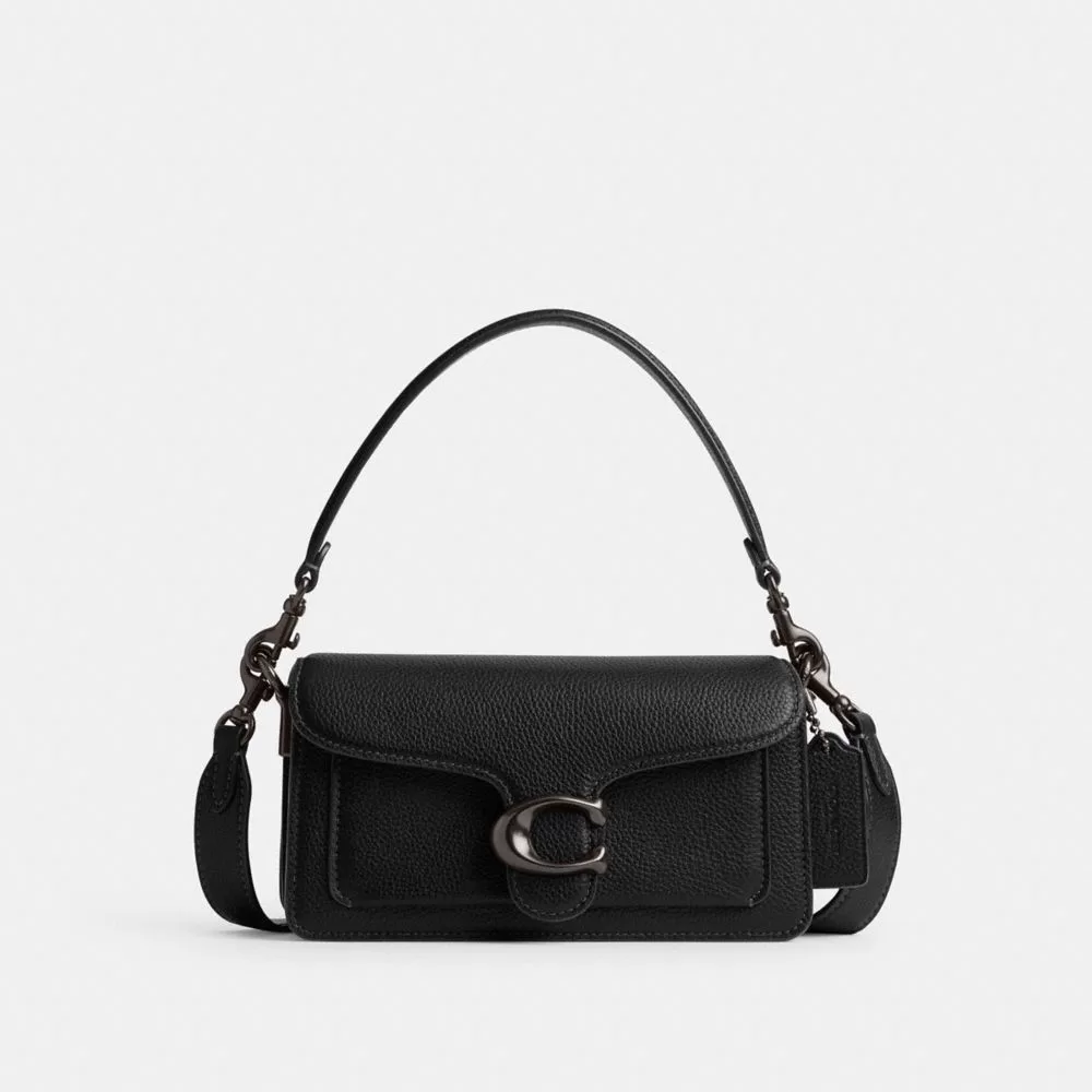A modern take on an archival 1970s Coach design, our structured Tabby shoulder bag is crafted of polished pebble leather. Smaller than the 26, the petite 20 features two detachable straps to carry by hand, style as a short shoulder bag or wear crossbody. It