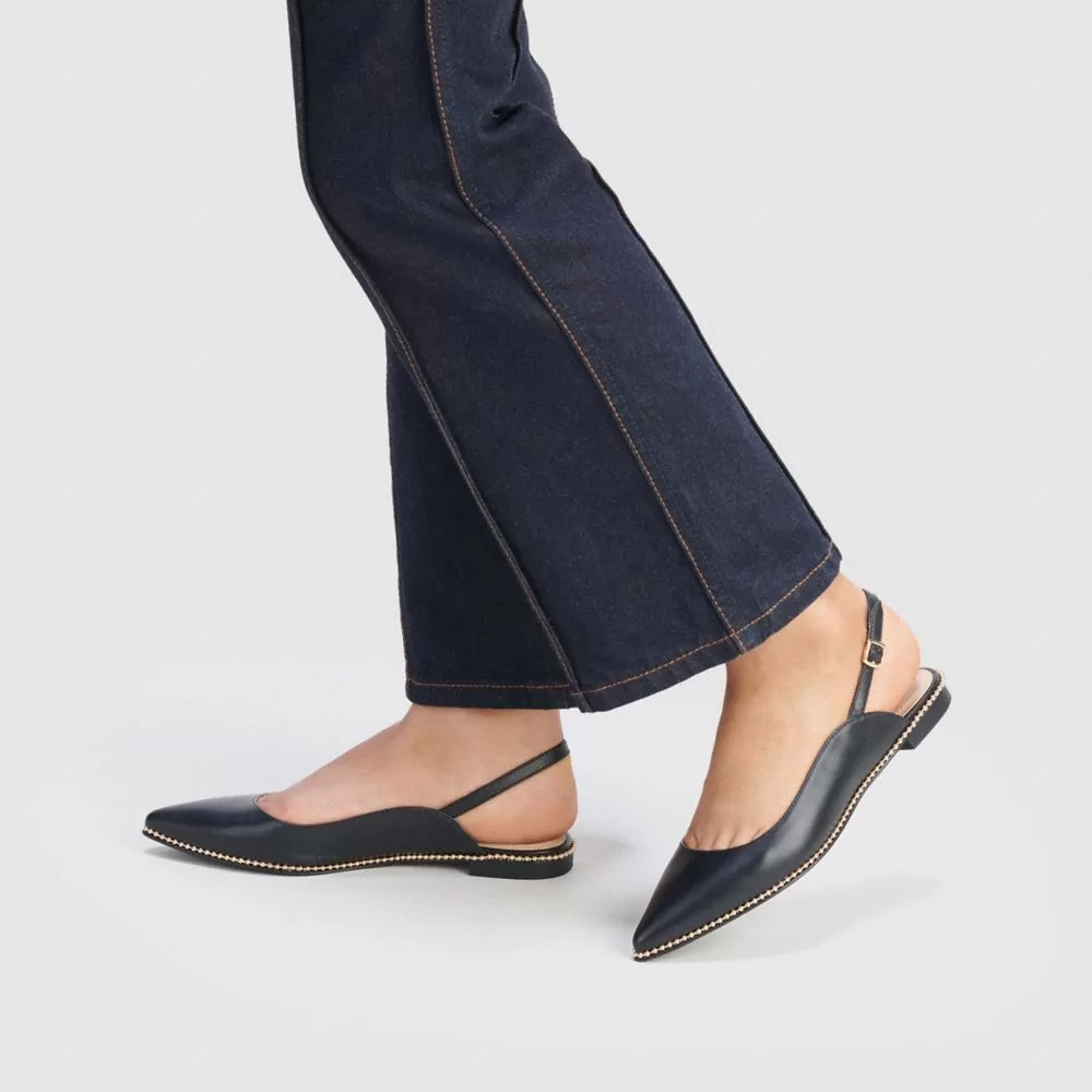 Crafted of smooth leather, our Vae skimmer features gleaming?beadchain trim for a touch of shine. The slingback style has a sleek pointed toe and is finished with a non-skid rubber sole and breathable, cushiony memory foam padding for all-day comfort.